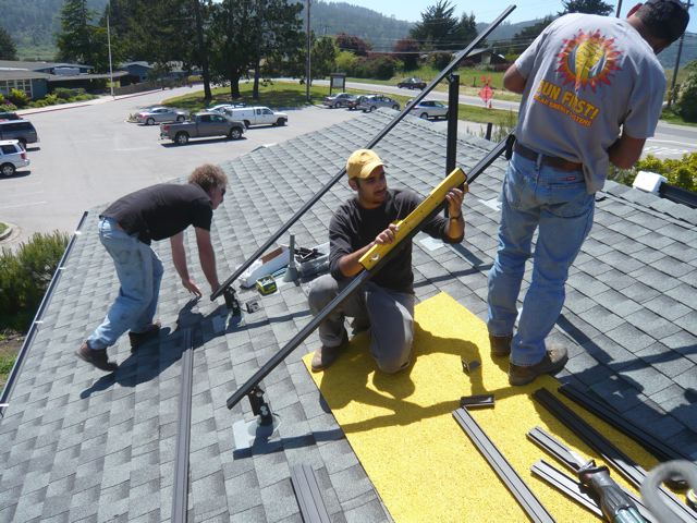 Sun First setting the mounting brackets for the solar thermal panels. Sun First donated all their labor and materials and sold us the panels at cost.